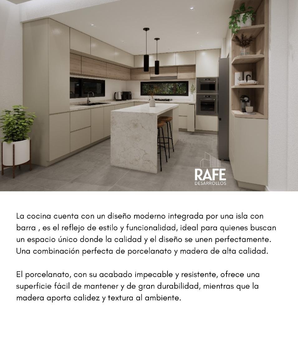 LA COCINA CUENTA CON UN DISEÑO MODERNO INTEGRADA POR UNA ISLA CON BARRA , ES EL REFLEJO DE ESTILO Y FUNCIONALIDAD, IDEAL PARA QUIENES BUSCAN UN ESPACIO ÚNICO DONDE LA CALIDAD Y EL DISEÑO SE UNEN PERFECTAMENTE. UNA COMBINACIÓN PERFECTA DE PORCELANATO Y MADERA DE ALTA CALIDAD. EL PORCELANATO, CON SU ACABADO IMPECABLE Y RESISTENTE, OFRECE UNA SUPERFICIE FÁCIL DE MANTENER Y DE GRAN DURABILIDAD, MIENTRAS QUE LA MADERA APORTA CALIDEZ Y TEXTURA AL AMBIENTE.