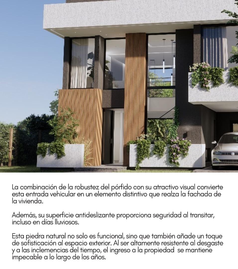 LA COMBINACIÓN DE LA ROBUSTEZ DEL PÓRFIDO CON SU ATRACTIVO VISUAL CONVIERTE ESTA ENTRADA VEHICULAR EN UN ELEMENTO DISTINTIVO QUE REALZA LA FACHADA DE LA VIVIENDA. ADEMÁS, SU SUPERFICIE ANTIDESLIZANTE PROPORCIONA SEGURIDAD AL TRANSITAR, INCLUSO EN DÍAS LUVIOSOS. ESTA PIEDRA NATURAL NO SOLO ES FUNCIONAL, SINO QUE TAMBIÉN AÑADE UN TOQUE DE SOFISTICACIÓN AL ESPACIO EXTERIOR. AL SER ALTAMENTE RESISTENTE AL DESGASTE Y A LAS INCLEMENCIAS DEL TIEMPO, EL INGRESO A LA PROPIEDAD SE MANTIENE IMPECABLE A LO LARGO DE LOS AÑOS.