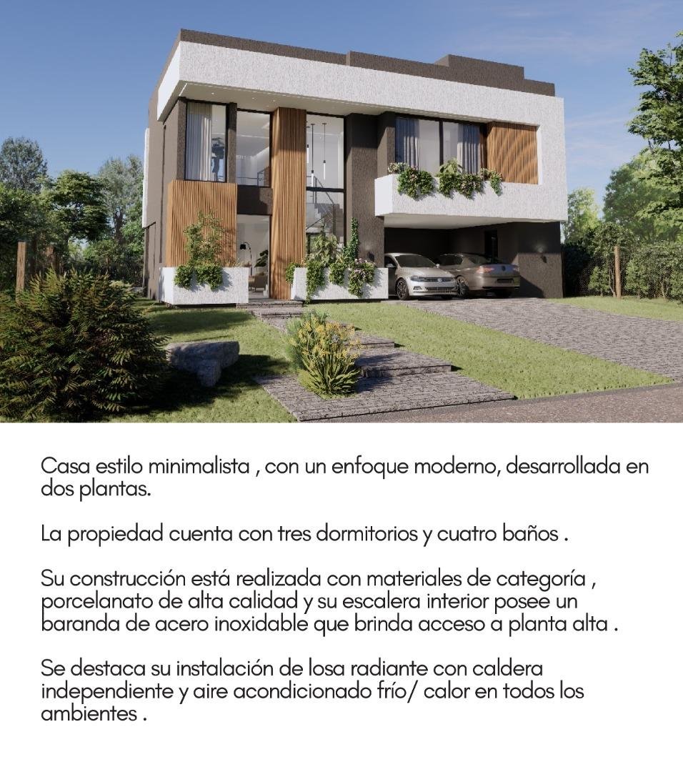 CASA ESTILO MINIMALISTA , CON UN ENFOQUE MODERNO, DESARROLLADA EN DOS PLANTAS. LA PROPIEDAD CUENTA CON TRES DORMITORIOS Y CUATRO BAÑOS . SU CONSTRUCCIÓN ESTÁ REALIZADA CON MATERIALES DE CATEGORÍA , PORCELANATO DE ALTA CALIDAD Y SU ESCALERA INTERIOR POSEE UN BARANDA DE ACERO INOXIDABLE QUE BRINDA ACCESO A PLANTA ALTA . SE DESTACA SU INSTALACIÓN DE LOSA RADIANTE CON CALDERA INDEPENDIENTE Y AIRE ACONDICIONADO FRÍO/ CALOR EN TODOS LOS AMBIENTES.